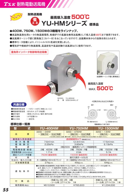 耐熱電動送風機耐熱送風機最高吸入温度500℃YU-HMシリ-ズ標準品●400W、750W、1500Wの3機種をラインナップ。●高温熱風発生用ヒータの熱風循環用、乾燥炉での風量改善用送風機として吸入温度500℃まで使用できます。●送風機ケーシング部に断熱施工(カバ-付)をおこなっていますので、送風機本体からの放熱を抑えられます。●標準モータ搭載により、イニシャルコスト低減を実現しました。●電気炉や焼鈍炉の熱風循環、高温排気や高温試験の送風源などに使用できます。送風機ケーシング部に断熱施工最高吸入温度MAX.500℃MODELYU-400HM品番3200-04HM--0°≪回転方向と吐出口の角度≫共通仕様●電動機周囲温度●電動機周囲湿度●据付場所●取付姿勢●吸入気体-10℃〜+40℃(凍結しないこと)::85%R.H.以下(非結露):風雨にさらされない場所(屋内仕様):水平設置のみ:一般空気標準仕様一覧表品番YU-400HM3200ー04HMーーYU-750HM3200ー075HMーーYU-1500HM3200ー1.5HMーーご注文時には型式と品番(欄外の図1、図2のいずれかの回転方向と吐出口角度)をご指定ください。最高吸入気体温度最最電大高風静量圧源電動機容量・絶縁定格電流値(200V・60Hz)適応インバータ容量材質吐出口/吸入口口径本体概算質量運転条件付属品販売価格(税込)557.6㎥/min2.25kPa2極400W・E種1.71A750W(重負荷用)17.5㎥/min6.15kPa2極1500W・F種5.7A2200W(重負荷用)連続500℃以下(電動機空冷式)12.4㎥/min3.85kPa3相200V(重負荷インバータ制御専用)2極750W・F種2.9A1500W(重負荷用)接ガス部オールSUSホース接続用φ100mm合フランジホース接続用φ125mm合フランジホース接続用φ125mm合フランジ45㎏±5%27㎏±5%64㎏±5%●本送風機は高温循環時に性能が確保されるよう設計しているため、上記の適応インバータが必要です。必ず、適応インバータ(重負荷用)を使用し20Hz〜60Hzにて運転してください。※適応インバータのパラメータ設定については事前にお問い合わせください。●電動機の冷却効率に影響するため、頻繁な運転、停止は避けてください(運転継続目安時間10分以上)。●電動機の表面温度は80℃以下の範囲で運転してください。●長寿命化のため、吸入気体温度が450℃以下まで冷却してから停止することをおすすめします。・・防振ゴムKB-254個シール剤コアペイスト1本¥610,500¥765,600・・防振ゴムKB-354個シール剤コアペイスト1本¥1,034,000