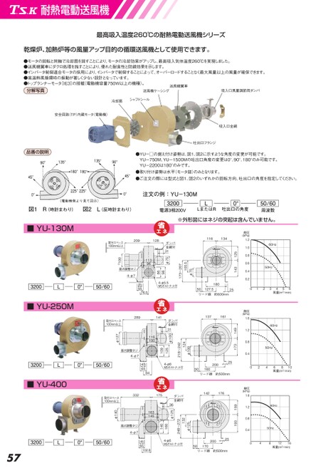 耐熱電動送風機最高吸入温度260℃の耐熱電動送風機シリーズ乾燥炉、加熱炉等の風量アップ目的の循環送風機として使用できます。●モータの回転と同軸で冷却扇を回すことにより、モータの冷却効果がアップし、最高吸入気体温度260℃を実現しました。●送風機翼車にダクロ処理を施すことにより、優れた耐食性と防錆効果を示します。●インバータ制御適合モータの採用により、インバータで制御することによって、オーバーロードすることなく最大風量以上の風量が確保できます。●高温熱風循環時の振動が著しく少ない設計となっています。●トップランナーモータ[IE3]の搭載(電動機容量750W以上の機種)。送風機翼車送風機ケーシング冷却扇シャフトシール安全回路(TP)内蔵モータ(電動機)吸入口風量調節用ダンパ吸入口金網吐出口フランジ分解写真品番の説明●YU-□の据え付け姿勢は、図1、図2に示すような角度の変更が可能です。YU-750M、YU-1500Mの吐出口角度の変更は0°、90°、180°のみ可能です。YU-2200は180°のみです。●取り付け姿勢は水平(モータ部)のみとなります。●ご注文の際には型式と図1、図2のいずれかの回転方向、吐出口の角度を指定してください。注文の例:YUー130M3200電源3相200VLLまたはR0°吐出口の角度50/60周波数※外形図にはネジの突起は含んでいません。静圧(kPa)1.21.00.80.60.40.2静圧(kPa)1.61.20.80.4静圧(kPa)1.61.20.80.460Hz50Hz0123546風量(m3/min)60Hz50Hz0241680風量(m3/min)60Hz50Hz14917315919312514311613418050127.525リード線約600mm137161φ75105.5173〜207ダンパ金網付31φ754-φ5.5M5ボルト・ナット付9886図1R(時計まわり)図2L(反時計まわり)■YU-130M取付スペース100mm以上209128355576.511396高さ調整ネジ4-φ71003200L0°50/60■YU-250M289141ダンパ金網付31φ100124218〜242125109φ100116100高さ調整ネジ4-φ7φ127取付スペース100mm以上332175ダンパ金網付142176φ125132248〜27236φ125163145160140高さ調整ネジ4-φ7φ140取付スペース100mm以上3200L0°50/604565844-φ6M5ボルト・ナット付2520050160リード線約500mm■YU-4003200L0°50/604565102.84-φ6M5ボルト・ナット付2002550170リード線約500mm0481216風量(m3/min)57
