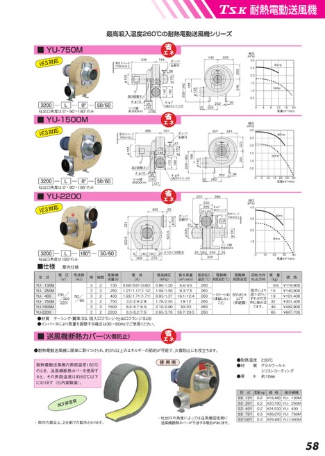 耐熱電動送風機最高吸入温度260℃の耐熱電動送風機シリーズ静圧(kPa)3.02.52.01.51.00.5静圧(kPa)3.02.52.01.51.00.5静圧(kPa)4.03.02.01.060Hz50Hz048161220風量(m3/min)60Hz50Hz051015202530風量(m3/min)60Hz50Hz010203040風量(m3/min)208246223261192226φ125185308〜3424-φ7M6ボルト・ナット付25238502051601404-φ9M8ボルト・ナット付2523850250φ150186329〜3631φ1504195170170145388201ダンパ金網付207241φ181リード線約800mm25取付スペース150mm以上8-φ7M6ボルト・ナット付250225102.5102.5250225102.5102.525739661φ200ダンパ金網付φ200523.530060321302.5■YU-2200対応EI33200吐出口角度は0°・90°180°のみ0°L50/60高さ調整ネジ4-φ10リード線約600mm95120127L3200吐出口角度は180°のみ■仕様屋内仕様180°50/6060140160403042704-10×30長丸2595230325ダンパ金網付36φ125335165140120φ163取付スペース150mm以上■YU-750M対応EI33200吐出口角度は0°・90°・180°のみ0°L50/60高さ調整ネジ4-φ10リード線約500mm95120108取付スペース150mm以上φ181■YU-1500M対応EI3価格¥119,900¥140,800¥191,400¥301,400¥482,900¥667,700型式電圧(V)周波数(Hz)相極数電動機容量(W)電流(A)最高静圧(kPa)最大風量(m3/min)最高吸入温度(°C)電動機周囲温度(°C)電動機周囲湿度回転方向吐出方向質量(kg)0.86/1.201.08/1.550.93/1.371.78/2.552.10/2.902.65/3.785.4/4.59.3/7.516.1/12.419/1230/2338.7/29.0260260260260260260-10〜+40(凍結しないこと)85%R.H.以下(非結露)指示により図1・2のいずれかの方向に組み立てます。8.615193240652225060200200(220)YU-130MYU-250MYU-400YU-750MYU-1500MYU-2200●材質ケーシング・翼車:SS、吸入口フランジ・吐出口フランジ:SUS●インバータにより風量を調整する場合は30〜60Hzでご使用ください。0.68/0.61(0.60)1.27/1.17(1.12)1.95/1.71(1.71)3.2/2.9(2.9)6.2/5.7(5.4)8.3/8.2(7.5)13025040075015002200222333333■送風機断熱カバー(火傷防止)●耐熱電動送風機に簡単に取りつけられ、約3%以上のエネルギーの節約が可能で、火傷防止にも役立ちます。耐熱電動送風機の表面温度160℃のとき、送風機断熱カバーを使用すると、その表面温度は約60℃以下になります(社内実験値)。使用例・取付の都合上、2分割での製作となります。・吐出口の角度によっては送風機固定脚に送風機断熱カバーが干渉する場合があります。●耐熱温度230℃●材質グラスウール+シリコンコーティング●厚さ約10㎜型式質量(kg)価格適合機種SD13YSD25YSD40YSD75YSD150Y0.20.20.20.30.3¥18,480¥20,790¥24,530¥26,070¥29,480YU-130MYU-250MYU-400YU-750MYU-1500M58