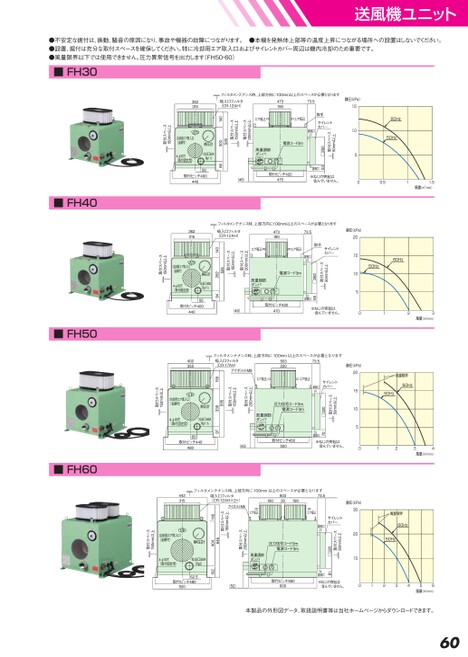 ●不安定な据付は、振動、騒音の原因になり、事故や機器の故障につながります。●本機を発熱体上部等の温度上昇につながる場所への設置はしないでください。●設置、据付は充分な取付スペースを確保してください。特に冷却用エア取入口およびサイレントカバー周辺は機内冷却のため重要です。●風量限界以下では使用できません。圧力異常信号を出力します(FH50・60)送風機ユニット■FH30■FH40■FH50■FH60フィルタメンテナンス時、上部方向に100mm以上のスペースが必要となります(CR-12AH)フィルタメンテナンス時、上部方向に100mm以上のスペースが必要となります(CR-12AH)静圧(kPa)1510560Hz50Hz00.511.5風量(m3/min)静圧(kPa)2015105060Hz50Hz123風量(m3/min)フィルタメンテナンス時、上部方向に100mm以上のスペースが必要となります(CR-17AH)静圧(kPa)風量限界60Hz50Hz201510501234風量(m3/min)静圧(kPa)302010風量限界60Hz50Hzフィルタメンテナンス時、上部方向に100mm以上のスペースが必要となります(CR-12AH×2ケ)0123456風量(m3/min)本製品の外形図データ、取扱説明書等は当社ホームページからダウンロードできます。60