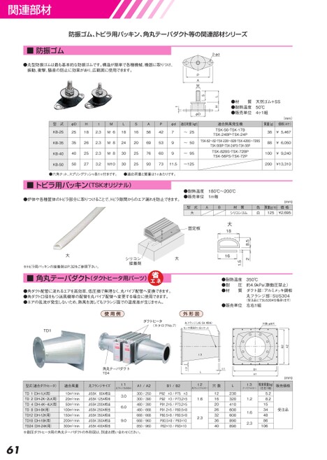 ●材質天然ゴム+SS●耐熱温度50℃●販売単位4ヶ1組SLφDHt型式KB-25KB-35KB-40KB-50φD25354050H18262527tM2.3M62.3M82.3M83.2M10L18243030S16202525A56697693P42536073φd適応荷重(kgf)799〜25〜50〜9511.5〜125適合熱風発生機TSK-56・TSK-17BTSK-24BP・TSK-24PTSK-62〜82・TSK-22B〜82B・TSK-42BS〜72BSTSK-56BP・TSK-24PS・TSK-56PTSK-82BS・TSK-72BPTSK-56PS・TSK-72P(mm)質量(g)価格(4ケ)38¥5,46788¥6,050100¥9,240200¥13,310●耐熱温度350℃●耐圧約4.9kPa(脈動圧禁止)●材質ダクト部:アルミメッキ鋼板丸フランジ部:SUS304(受注品にてSUS304仕様承ります)●販売単位左右1組●耐熱温度180℃〜200℃●販売単位1m毎(mm)質量(g/m)価格125¥2,695色白材質シリコンゴム型式AB大8.521.5大1816固定板●六角ナット、スプリングワッシャ各1ヶ付きです。●適応荷重と質量は1ヶあたりです。■トビラ用パッキン(TSKオリジナル)●炉体や各種筐体のトビラ部分に取りつけることで、トビラ隙間からのエア漏れを防止できます。大※トビラ用パッキンの接着剤はP.32をご参照下さい。シリコン接着剤大■角丸テーパダクト(ダクトヒータ用パーツ)●角ダクト配管に流れるエアを高効率、低圧損で無理なく、丸パイプ配管へ変換できます。●角ダクト口径をもつ送風機等の配管を丸パイプ配管へ変更する場合に使用できます。●エアの乱流が発生しないため、熱風を流してもフランジ面での温度差が生じません。使用例外形図ダクトヒータ(カタログNo.7)丸フランジ(JIS5K相当)センサ用RP1/8ソケット穴数-φ8穴TD1A2B2(mm)t1B1A1t3Lt2角丸テーパダクトTD4型式(適合ダクトヒータ)適合風量丸フランジサイズt1丸フランジ(SUS304)TD1(DH-1LK用)TD2(DH-2K・2LK用)TD4(DH-4K・4LK用)TD8(DH-8K用)TD12(DH-12K用)TD18(DH-18K用)TD24(DH-24K用)10m3/min20m3/min50m3/min100m3/min150m3/min200m3/min300m3/minJIS5K80A相当JIS5K125A相当JIS5K200A相当JIS5K250A相当JIS5K350A相当JIS5K350A相当JIS5K400A相当3.06.09.0A1/A2300/250300/390480/390480/668668/668668/960850/960※耐圧ダクトヒータ用の角丸テーパダクトの外形図は、別途お問い合わせください。B1/B2t2角フランジ(アルスター)穴数P92×3/P75×3P92×3/P73.2×5P91.2×5/P73.2×5P91.2×5/P80.5×8P80.5×8/P80.5×8P80.5×8/P93×10P82×10/P93×101.62.312162026323640L230320410600600890890t3テーパ(アルスター)概算質量(㎏)(左右1組)販売価格1.21.62.35.28.215344886106受注品61関連部材■防振ゴム防振ゴム、トビラ用パッキン、角丸テーパダクト等の関連部材シリーズ2-φdPAM●丸型防振ゴムは最も基本的な防振ゴムです。構造が簡単で各種機械、機器に取りつけ、振動、衝撃、騒音の防止に効果があり、広範囲に使用できます。