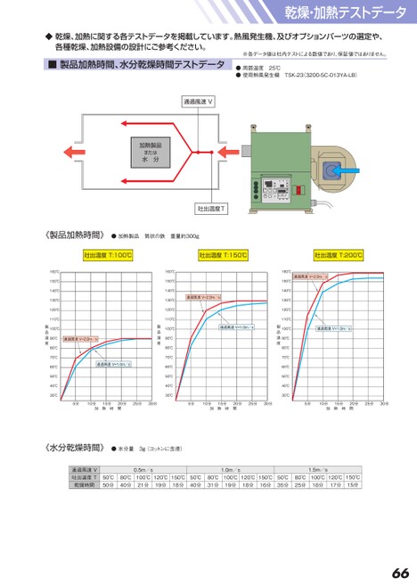 乾燥・加熱テストデータ●周囲温度25℃●使用熱風発生機TSK-23(3200-5C-013YA-LB)◆乾燥、加熱に関する各テストデータを掲載しています。熱風発生機、及びオプションパーツの選定や、各種乾燥、加熱設備の設計にご参考ください。※各データ値は社内テストによる数値であり、保証値ではありません。■製品加熱時間、水分乾燥時間テストデータ通過風速V加熱製品または水分25分30分66吐出温度T:100℃吐出温度T:150℃吐出温度T:200℃通過風速V=2.0m/s通過風速V=1.0m/s160℃150℃140℃130℃120℃110℃100℃90℃80℃70℃60℃50℃40℃30℃製品温度通過風速V=2.0m/s通過風速V=1.0m/s160℃150℃140℃130℃120℃110℃100℃90℃80℃70℃60℃50℃40℃30℃製品温度通過風速V=2.0m/s通過風速V=1.0m/s160℃150℃140℃130℃120℃110℃100℃90℃80℃70℃60℃50℃40℃30℃製品温度《製品加熱時間》●加熱製品筒状の鉄重量約300g吐出温度T5分10分15分20分加熱時間25分30分5分10分15分20分加熱時間25分30分5分10分15分20分加熱時間《水分乾燥時間》●水分量3g(コットンに含浸)通過風速V吐出温度T乾燥時間0.5m/s1.0m/s1.5m/s50℃50分80℃40分100℃21分120℃19分150℃18分50℃40分80℃31分100℃19分120℃18分150℃16分50℃35分80℃25分100℃18分120℃17分150℃15分