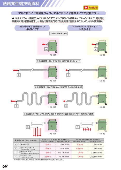 熱風発生機技術資料マルチドライヤ高風圧タイプとマルチドライヤ標準タイプの比較テスト◆マルチドライヤ高風圧タイプHAS-17Tとマルチドライヤ標準タイプHAS-12にて、同じ吐出風速時に同じ配管を施工した場合の配管出口での吐出風速の比較をおこなっています(実測値)。マルチドライヤ高風圧タイプHAS-17Tマルチドライヤ標準タイプHAS-12①吐出口配管施工無しAHAS-17TAHAS-12②吐出口配管:ウルトラフレキホースUF505mストレートBBHAS-17THAS-12③吐出口配管:ウルトラフレキホースUF505m曲がり部6ヶ所CHAS-17TCHAS-12④吐出口にハイブローノズル25AL-200-1-S1(スリット長さ200㎜×スリット幅1.0㎜)を接続DDHAS-17THAS-12測定ポイント:吐出口配管条件A:①配管施工無しBCD③ウルトラフレキホース②ウルトラフレキホース:UF505mストレート:UF505m曲がり部6ヶ所:25AL-200-1-S1④ハイブローノズルマルチドライヤ高風圧タイプHAS-17T吐出風速(実測値)吐出風量(計算値)13m/s12m/s6m/s25m/s1.5㎥/min1.4㎥/min0.71㎥/min0.3㎥/minマルチドライヤ標準タイプHAS-12吐出風速(実測値)吐出風量(計算値)13m/s8.5m/s3m/s3m/s1.5㎥/min1.0㎥/min0.35㎥/min0.036㎥/min※マルチドライヤ高風圧タイプHAS-17Tの詳細はカタログNo.2をご参照ください。69