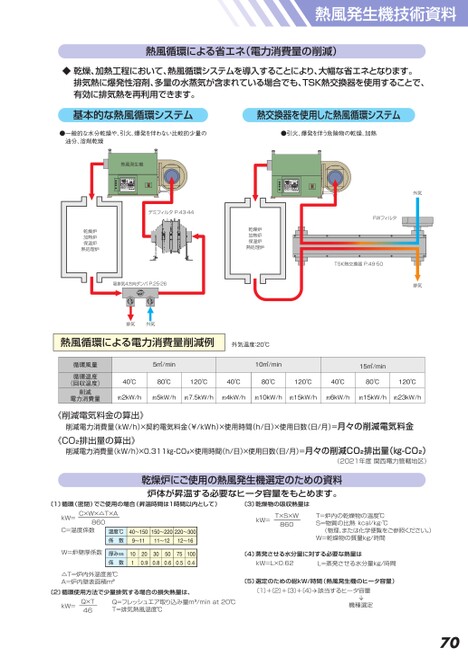 熱風発生機技術資料熱風循環による省エネ(電力消費量の削減)◆乾燥、加熱工程において、熱風循環システムを導入することにより、大幅な省エネとなります。排気熱に爆発性溶剤、多量の水蒸気が含まれている場合でも、TSK熱交換器を使用することで、有効に排気熱を再利用できます。基本的な熱風循環システム熱交換器を使用した熱風循環システム●一般的な水分乾燥や、引火、爆発を伴わない比較的少量の油分、溶剤乾燥●引火、爆発を伴う危険物の乾燥、加熱熱風発生機デミフィルタP.43・44FWフィルタ乾燥炉加熱炉保温炉熱処理炉乾燥炉加熱炉保温炉熱処理炉TSK熱交換器P.49・50吸排気4方向ダンパP.25・26排気外気外気排気熱風循環による電力消費量削減例外気温度:20℃循環風量循環温度(回収温度)削減電力消費量5㎥/min10㎥/min15㎥/min40℃80℃120℃40℃80℃120℃40℃80℃120℃約2kW/h約5kW/h約7.5kW/h約4kW/h約10kW/h約15kW/h約6kW/h約15kW/h約23kW/h《削減電気料金の算出》削減電力消費量(kW/h)×契約電気料金(¥/kWh)×使用時間(h/日)×使用日数(日/月)=月々の削減電気料金《CO₂排出量の算出》削減電力消費量(kW/h)×0.311㎏-CO₂×使用時間(h/日)×使用日数(日/月)=月々の削減CO₂排出量(㎏-CO₂)(2021年度関西電力管轄地区)kcal/kg・℃70