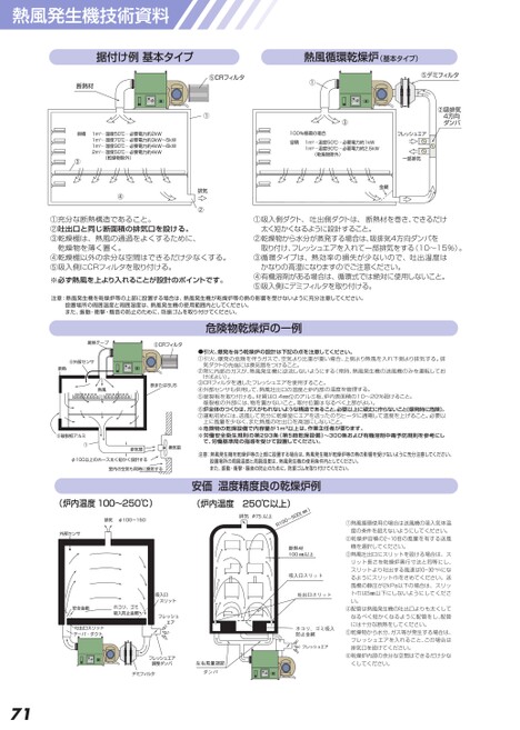 熱風発生機技術資料注意:熱風発生機を乾燥炉等の上部に設置する場合は、熱風発生機が乾燥炉等の熱の影響を受けないように充分注意してください。設置場所の周囲温度と周囲湿度は、熱風発生機の使用範囲内としてください。また、振動・衝撃・騒音の防止のために、防振ゴムを取り付けてください。293300注意:熱風発生機を乾燥炉等の上部に設置する場合は、熱風発生機が乾燥炉等の熱の影響を受けないように充分注意してください。設置場所の周囲温度と周囲湿度は、熱風発生機の使用条件内としてください。また、振動・衝撃・騒音の防止のために、防振ゴムを取り付けてください。(炉内温度100〜250℃)(炉内温度250℃以上)排気75以上(005〜001R)㎜断熱材100㎜以上吸入口スリット吐出口スリットホコリ、ゴミ吸入防止金網左右風量調節ダンパ71①熱風循環使用の場合は送風機の吸入気体温度の条件を超えないようにしてください。②乾燥炉容積の2~10倍の風量を有する送風機を選択してください。③熱風吐出口にスリットを設ける場合は、スリット長さを乾燥炉奥行寸法と同等にし、スリットより吐出する風速は10~30m/sになるようにスリット巾をきめてください。送風機の静圧が2kPa以下の場合は、スリット巾は5㎜以下にしないようにしてください。④配管は熱風発生機の吐出口よりも太くしてなるべく短かくなるように配管をし、配管には十分な断熱をしてください。⑤乾燥物から水分、ガス等が発生する場合は、フレッシュエアを入れること、この場合は排気口を設けてください。⑥乾燥炉内部の余分な空間はできるだけ少なくしてください。