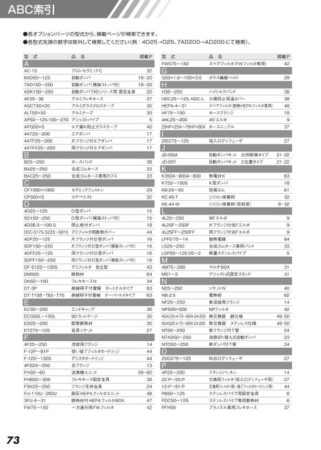 ABC索引●各オプションパーツの型式から、掲載ページが検索できます。●各型式先頭の数字は除外して検索してください(例:4D25→D25、7AD200→AD200にて検索)。品名スペアフィルタ(FWフィルタ専用)掲載P42ガラス繊維ベルトハイトルクバンド火傷防止保温カバースペアフィルタ(耐熱HEPAフィルタ専用)ホースフランジ45°エルボホースニップル吸入口ディフューザ293839481893727自動ダンパキット比例制御タイプ自動ダンパキット2位置タイプ21・2221・22631861328・329996433531314062144249・5049・50242324271427446637熱電対KK型ダンパ防振ゴムシリコン接着剤シリコン接着剤(低粘度)90°エルボ片フランジ付90°エルボ両フランジ付90°エルボ耐熱電線合成ゴムホース専用バンド軽量ステンレスパイプマルチBOXアジャスト式固定スタンドソケットN電熱板新溶接用フランジNPフィルタ熱交換器銅仕様熱交換器ステンレス仕様新フランジ付T管流路切り替え式自動ダンパ新ダンパ付T管吐出口ディフューザフランジパッキン交換用フィルタ(吸入口ディフューザ用)交換用フィルタ(使い捨てフィルタカートリッジ用)ステンレスパイプ用固定金具ステンレスパイプ専用断熱材プラノズル専用フレキホース型式FWS75〜150G50×1.6〜100×3.0H38〜250HDC25〜125、HDC-LHEPA-4〜31HF75〜1504HL25〜20025HP×25A〜76HP×80A2IDZ75〜125JD-05MJD-05TK350A・600A・800K75S〜150SKB-25〜50KE-45-TKE-44-W4L25〜2504L25F〜250F4L25FF〜250FFLFF0.75〜14LS25〜250LSP50〜125-05〜2MN4M75〜200MS1〜3N25〜250NB-2.5NF25〜250NP500×500NSAC20-4-75〜60W-24-200NSAS20-4-75〜60W-24-200NT50〜250NTAD50〜250NTD50〜2502ODZ75〜1254P25〜20022-P〜55-P12-P〜81-PPB50〜125PDC50〜125PFH50OPGHJIKL型式AAC-156AD50〜1257AD150〜250ADK150〜250AF25・38AGCT50×20ALT50×50AP50〜125-100〜270APG50×54AT25〜2004ATF25〜2004ATFF25〜200BCDB25〜250BA25〜250BAC25〜250CF1000×1000CP500×54D25〜1255D150〜2504D38-S〜100-SDDC-S17S/S22S〜S81S4DF25〜1255DF150〜2504DFF25〜1255DFF150〜250DF-S12S〜130SDM500DN50〜100DT-3PDT-T108・T83・T75EFEC50〜250ECG50L〜150LED25〜200ETZ75〜1254F25〜250F-12P〜81PF-12S〜130S4FD25〜250FH30〜60FHB50〜300FSK25〜250FU-110U・200U3FU-4〜31FW75〜150品名アロンセラミックC自動ダンパ自動ダンパ(補強ストッパ付)自動ダンパ7ADシリーズ用固定金具アルミフレキホースアルミガラスクロステープアルミテープアジャストパイプエア漏れ防止ガラステープエアダンパ片フランジ付エアダンパ両フランジ付エアダンパ掲載P3219・2019・2020373030540171717ホースバンド合成ゴムホース合成ゴムホース専用カフスセラミックフェルトンコアペイストD型ダンパD型ダンパ(補強ストッパ付)閉止板付ダンパデミフィルタ用断熱カバー片フランジ付D型ダンパ片フランジ付D型ダンパ(補強ストッパ付)両フランジ付D型ダンパ両フランジ付D型ダンパ(補強ストッパ付)デミフィルタ自立型断熱材フレキホースN絶縁碍子付電極ターミナルタイプ絶縁碍子付電極テーパハトメタイプエンドキャップ90゜カットゲージ配管断熱材延長ソケット38333329321515184416161616436434636336303027溶接用フランジ使い捨てフィルタカートリッジデミスタカートリッジ合フランジ送風機ユニットフレキホース固定金具フランジ支持金具耐圧HEPAフィルタユニット断熱材付HEPAフィルタBOX一方通行用FWフィルタ1444441359・60382448474273