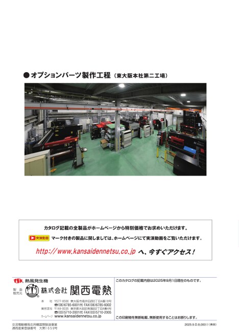 (東大阪本社第二工場)マーク付きの製品に関しましては、ホームページにて実演動画をご覧いただけます。http:www.kansaidennetsu.co.jpこのカタログの記載内容は2025年9月1日現在のものです。www.kansaidennetsu.co.jp2025.9.D.8,000㉑(奥田)